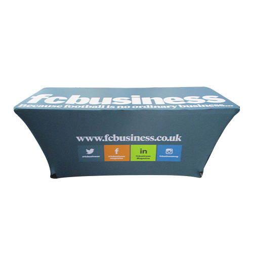 Printed digitally all colours with your branding, our tablecloths are available fitted or stretched to fit a standard Trestle Table (6ft x 30in / 182 x 78cm)